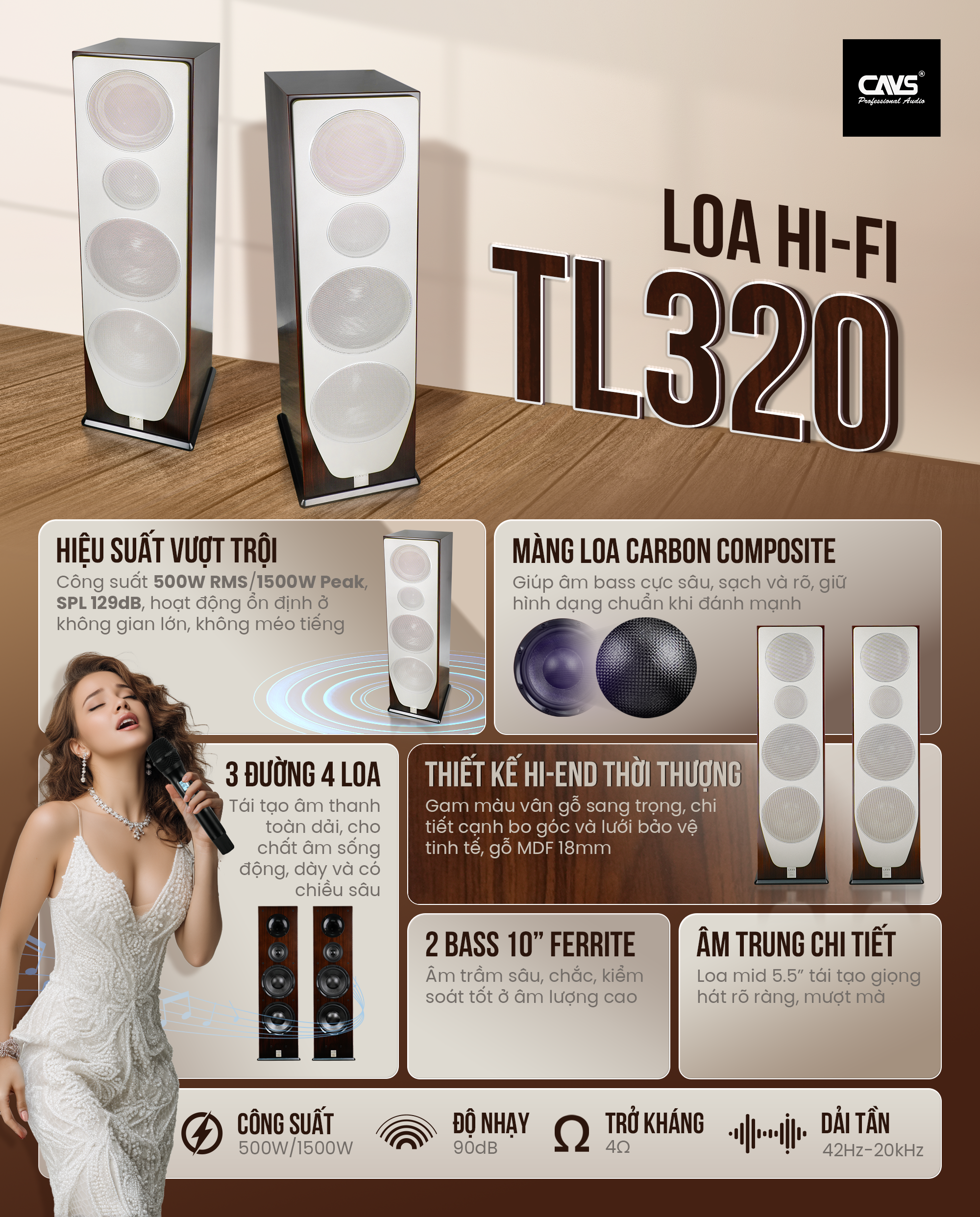 Một hệ thống âm thanh đẳng cấp không chỉ để nghe, mà để cảm nhận, đắm chìm và tận hưởng trọn vẹn từng khoảnh khắc. Với triết lý đó, CAVS chính thức giới thiệu Loa Hi-Fi TL320 – mẫu loa hội tụ giữa sức mạnh – độ tinh tế – chuẩn mực Hi-end, mang đến trải nghiệm karaoke chuyên nghiệp và nghe nhạc Hi-Fi cao cấp ngay tại gia.