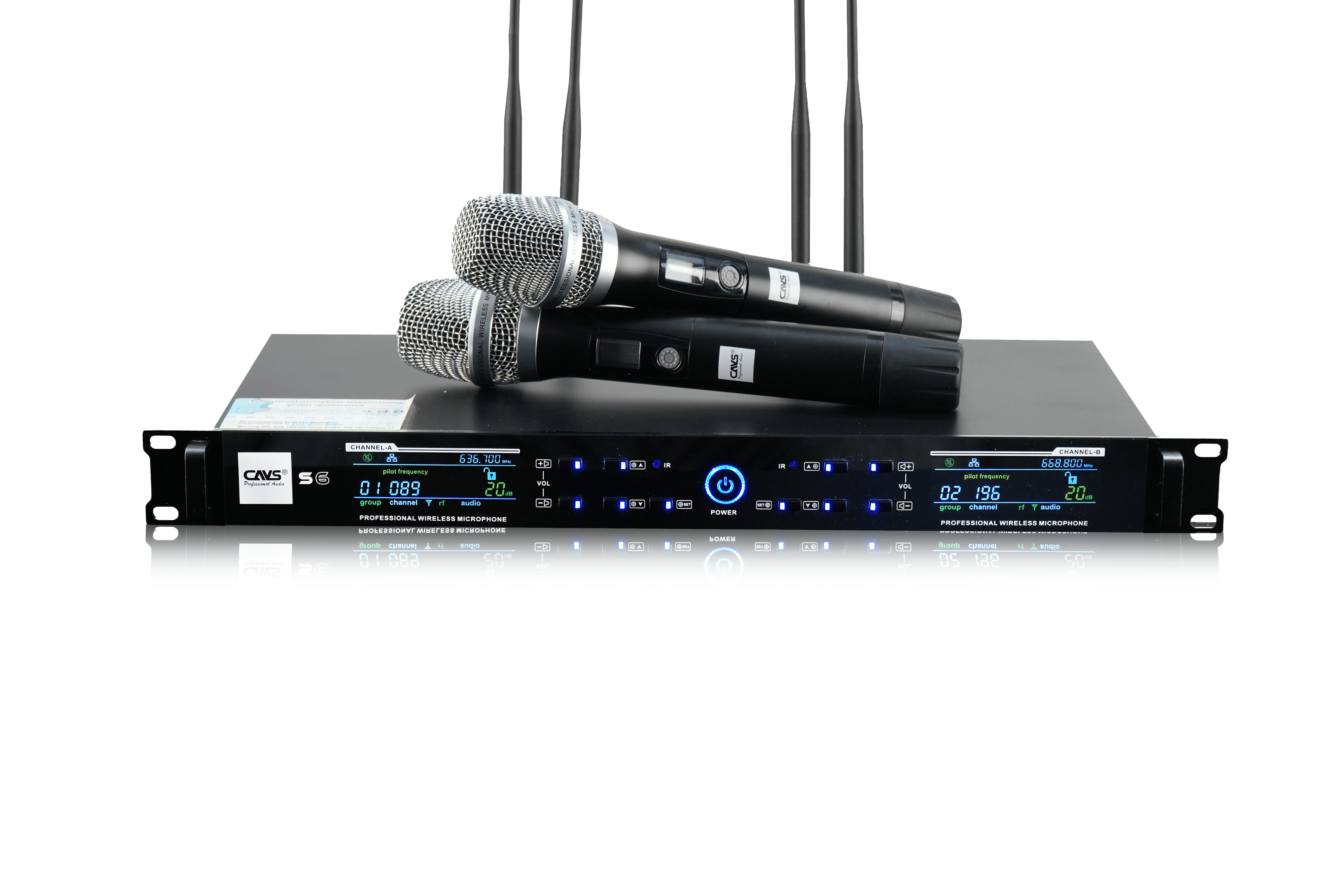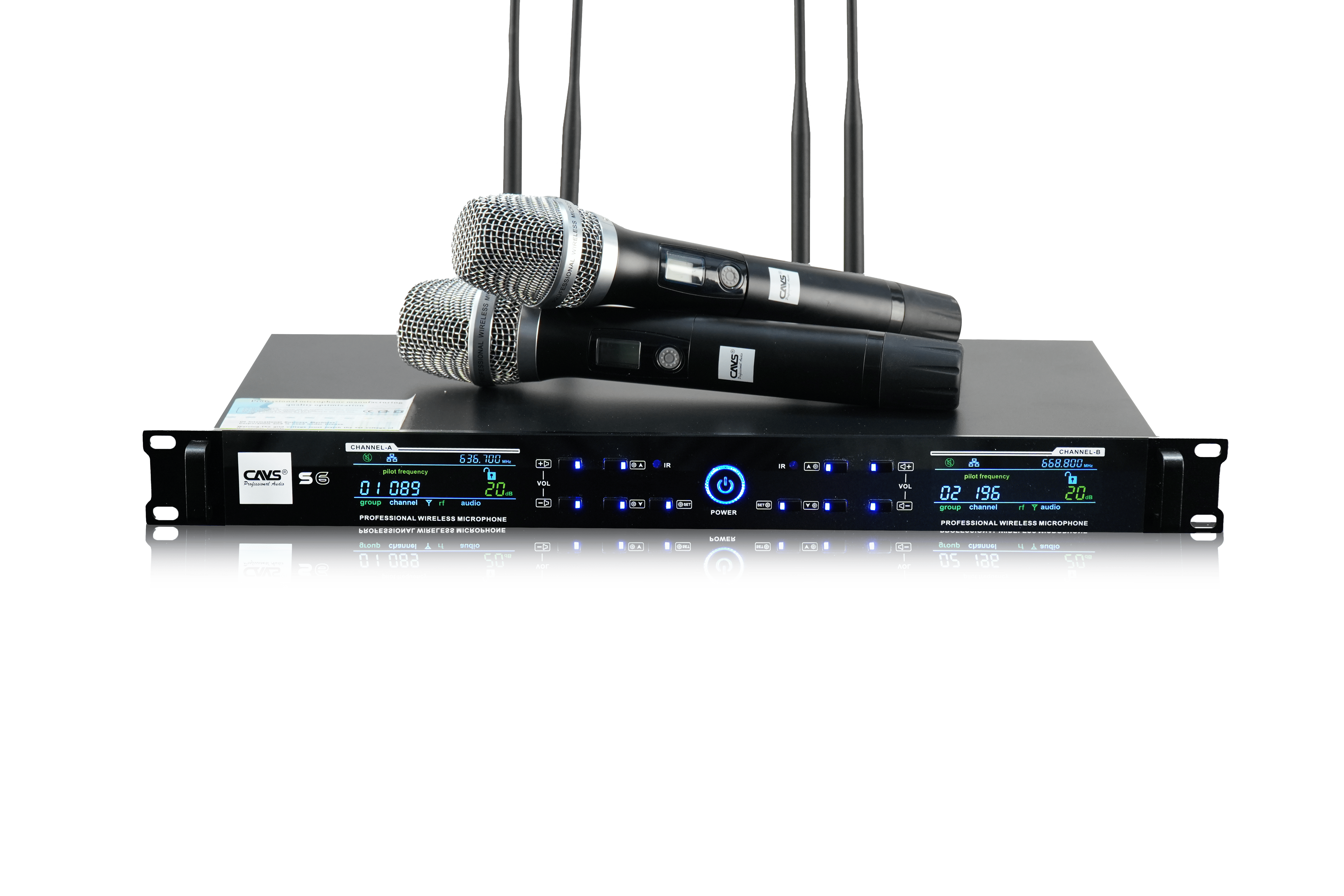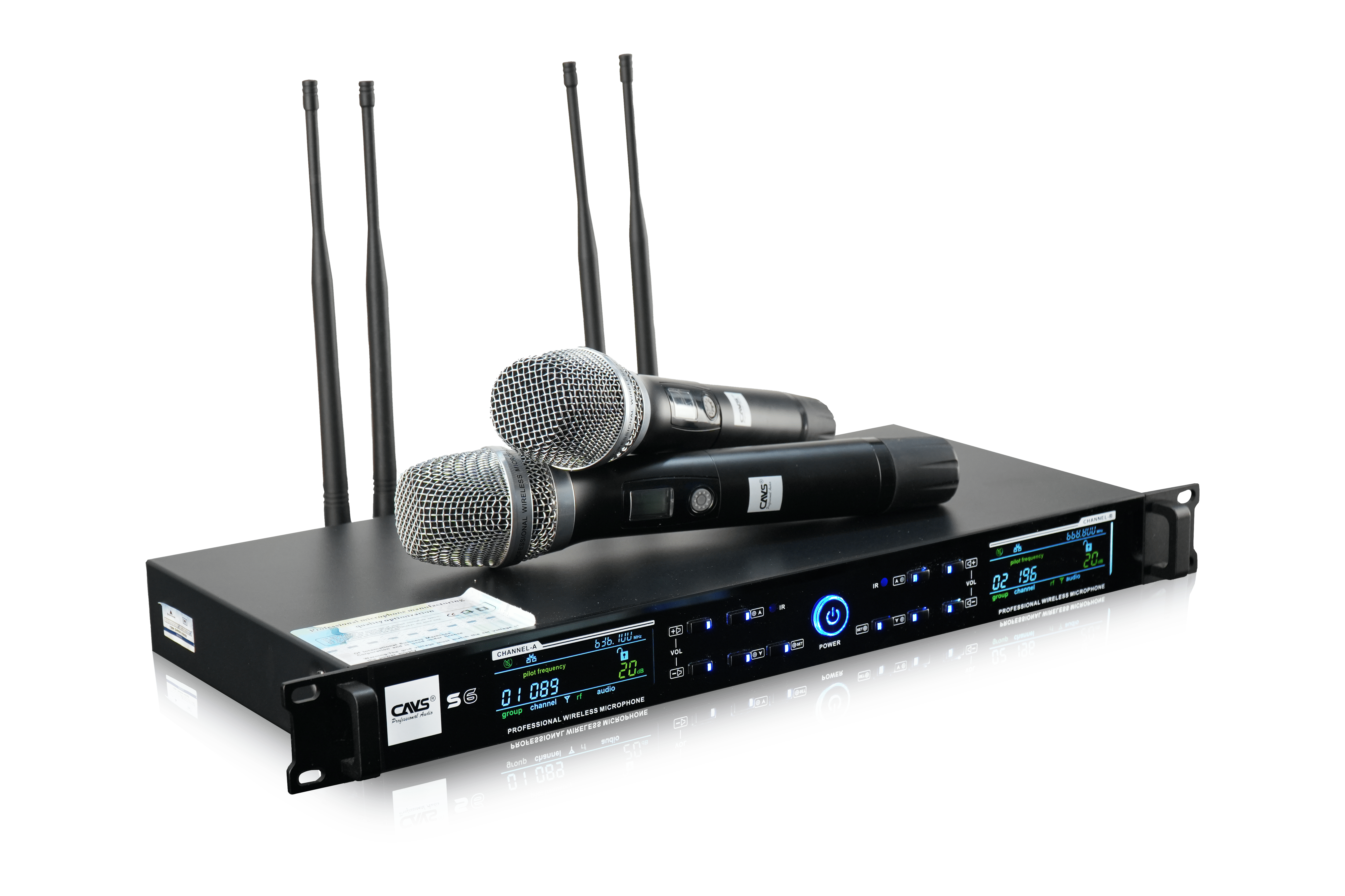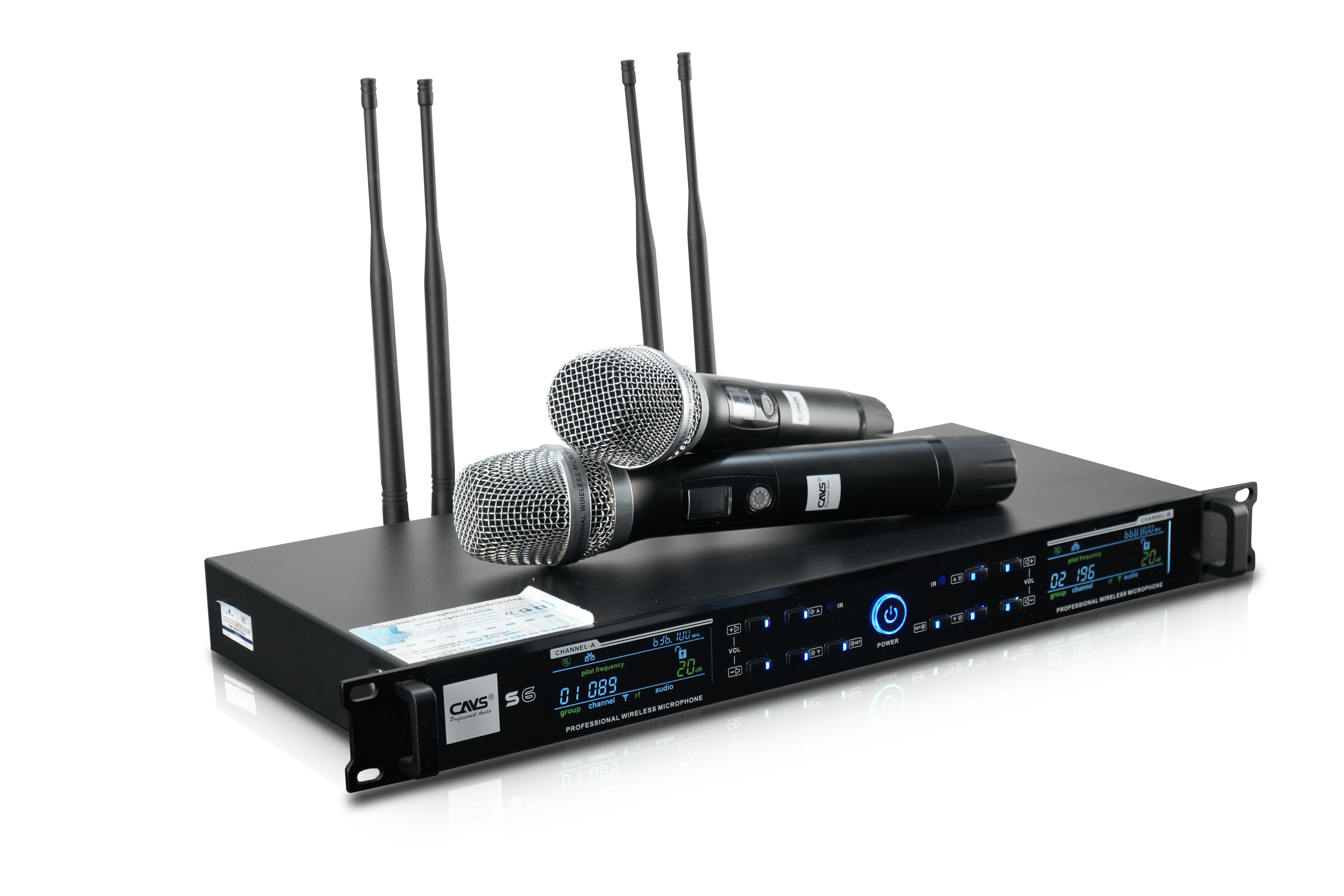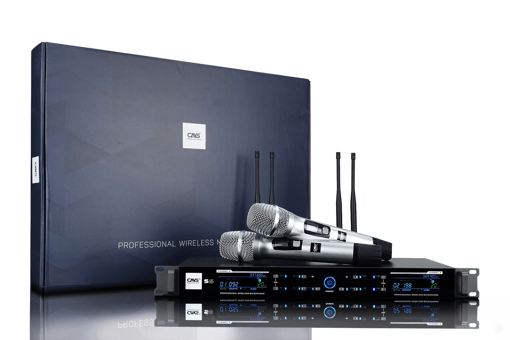 Micro không dây CAVS S6 gồm bộ thu và hai micro không dây. Sản phẩm hỗ trợ 200 kênh tần số, tích hợp Auto Sync, Auto Scan và Auto Mute. Thiết bị tương thích tốt với amply, mixer, dàn karaoke gia đình, phòng hát kinh doanh và các hệ thống âm thanh nhỏ.